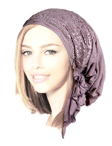 Lavender purple tichel pre tied head scarves for boho chic head scarf, tichel, head scarves, chemo hat, hair snood, chemo head scarf, and pre tied bandana wearers. This pre tied offers the benefits of a snood, head scarf, tichel, hair snood, tichel snood, chemo head scarf, & head scarf all in one! Gorgeous lightweight soft cotton pre tied head scarves embellished with wide floral lace in your choice of color! Lightweight and perfect for all year round! A hassle-free alternative to covering your hair! Great accessory for tichel, hair snood, head scarf, & bandana wearers!