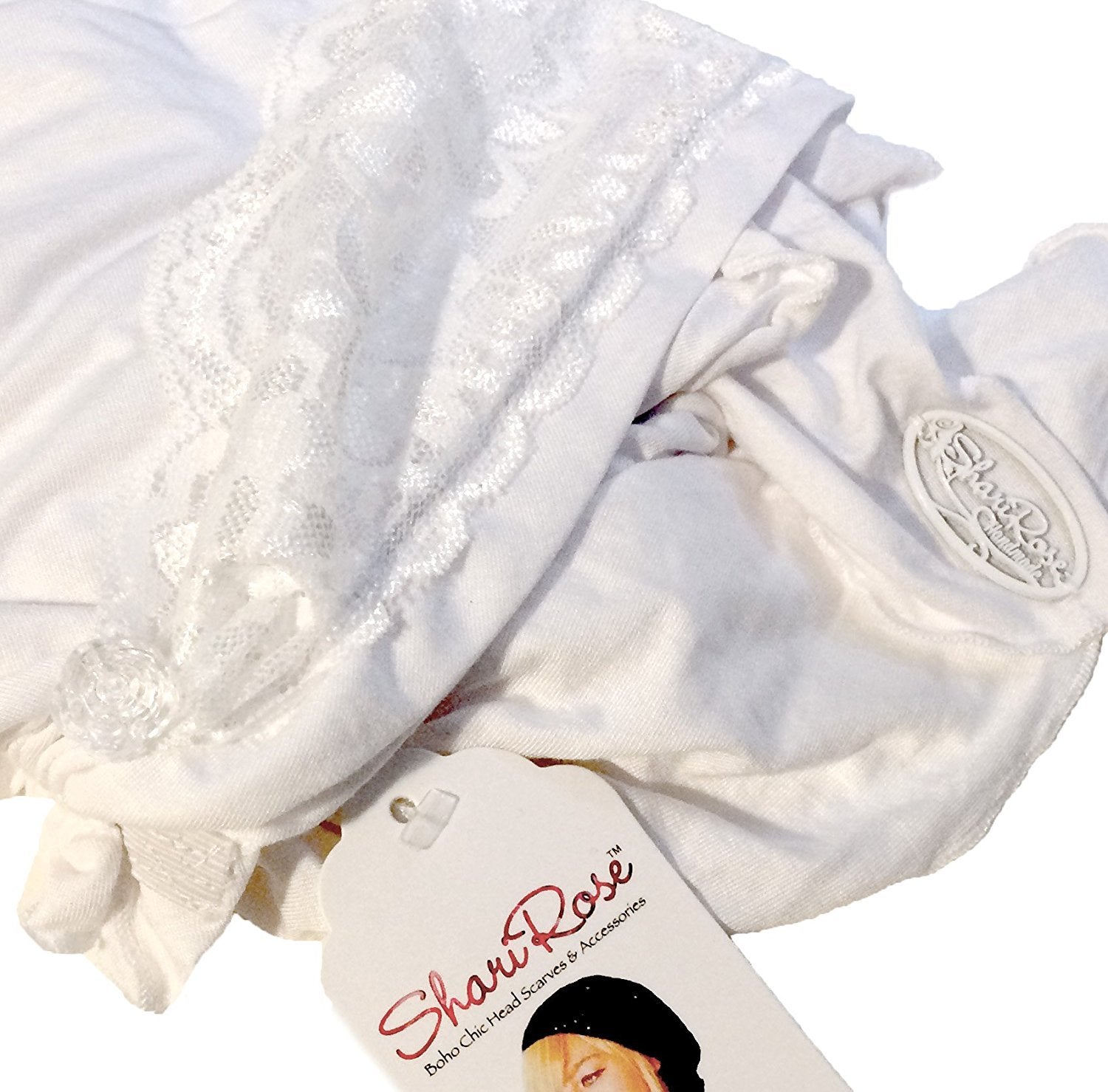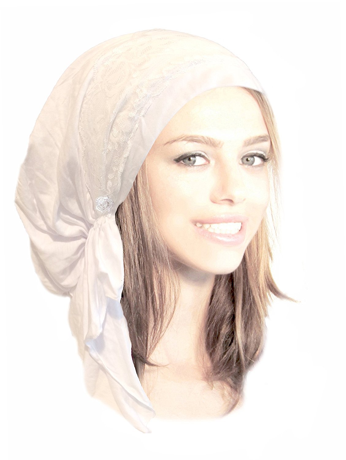 White pre tied head scarves for boho chic head scarf, tichel, head scarves, chemo hat, hair snood, chemo head scarf, and pre tied bandana wearers. This pre tied offers the benefits of a snood, head scarf, tichel, hair snood, tichel snood, chemo head scarf, & head scarf all in one! Gorgeous lightweight soft cotton pre tied head scarves embellished with wide floral lace and two clear rose buttons! Lightweight and perfect for all year round! A hassle-free alternative to covering your hair! Great accessory for tichel, hair snood, head scarf, & bandana wearers!
