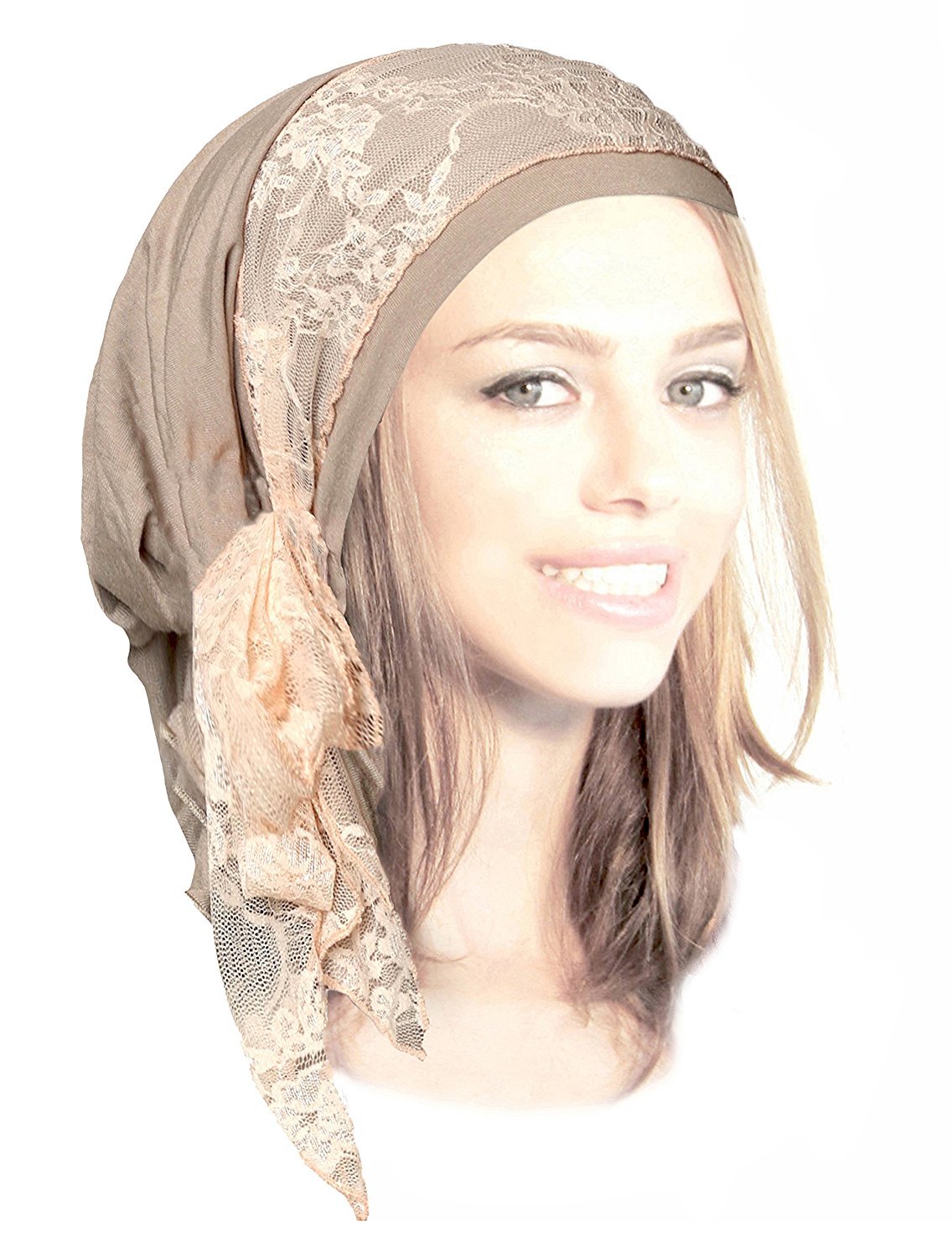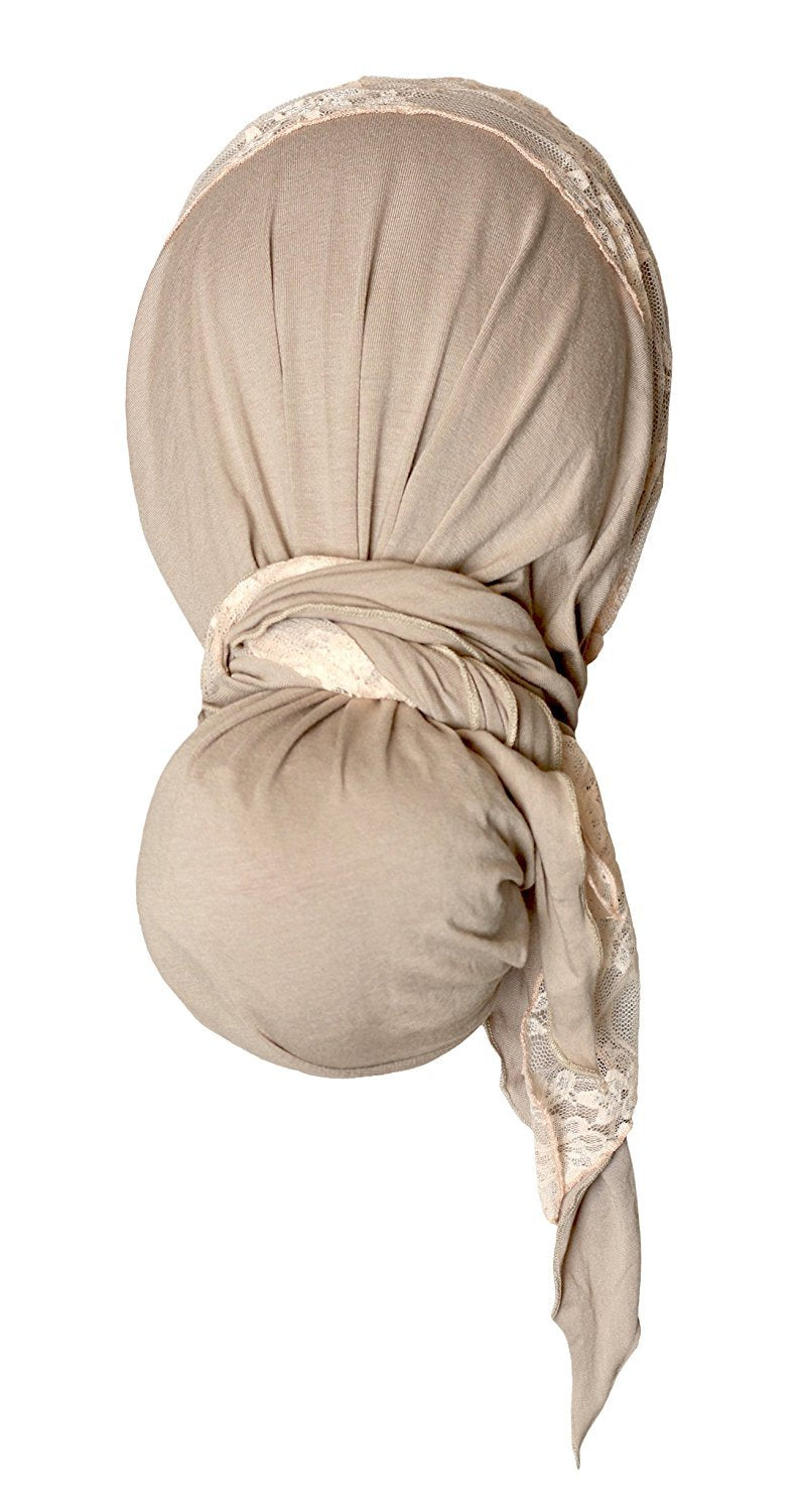 Head scarf taupe pink pre tied bandana for boho chic head scarves, tichel, head scarves, chemo hat, hair snood, chemo head scarf, and snood wearers. This pre tied offers the benefits of a hair snood, chemo head-wear, head wrap, hair snood, chemo head scarf, & chemo cap all in one! Gorgeous soft long taupe cotton pre tied head scarf with attached pink floral lace wrap! This taupe boho chic head scarf can be tied and worn many ways! Far more stunning in person! Lightweight and perfect for all year round! A hassle-free alternative to covering your hair! Great accessory for tichel, hair snood, head scarf, & bandana wearers!