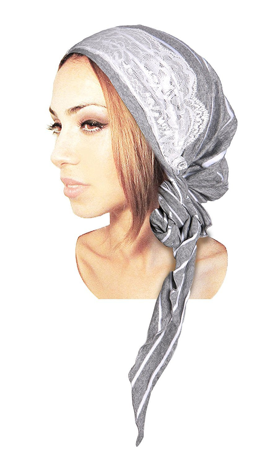 Gray boho chic headscarf pre tied head scarves for boho chic head scarf, tichel, head scarves, chemo hat, hair snood, chemo head scarf, and pre tied bandana wearers. This pre tied offers the benefits of a snood, head scarf, tichel, hair snood, tichel snood, chemo head scarf, & head scarf all in one! Gorgeous lightweight soft cotton pre tied head scarves embellished with wide floral lace in your choice of color! Lightweight and perfect for all year round! A hassle-free alternative to covering your hair! Great accessory for tichel, hair snood, head scarf, & bandana wearers!