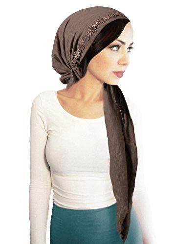 Brown taupe head scarf for tichel, hair snood, head scarves, chemo head scarf, pre tied bandana, snoods, and bandana wearers. This pre tied bandana offers the benefits of a tichel, hair snood, chemo head scarf. & head wrap all in one! Gorgeous taupe cotton jersey pre tied head scarf with a beautiful gold/taupe fancy floral applique! Stunning floral applique is so pretty in person! A must have for those festive occasions! Great accessory for tichel, hair snood, head scarf, & bandana wearers!